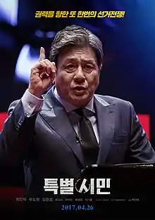 The Mayor (Korean: 특별시민; Hanja: 特別市民; RR: Teukbyeolsimin, lit. "Special Citizen") is a 2017 South Korean political drama film written and directed by Park In-je. It stars Choi Min-sik, Kwak Do-won, Shim Eun-kyung, Moon So-ri, Ra Mi-ran, Ryu Hye-young, and Ki Hong Lee.[2] The film was released in South Korea on April 26, 2017 and in the US and Canada on April 28.[3][4][5]