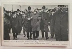 300 suffragettes marched to the House of Commons on 18 November 1910, to protest the rejection of the first Conciliation Bill. Captain Charles Melvill Gonne, a 48-year-old MPU member, intervened when a woman was being forcibly arrested by police and stated, 'You may take me, but you shall not take her.' A photograph of him being gripped by both arms and walked by police was then published in the Daily Mirror and later published as a Suffragist propaganda postcard for the cause.[11]