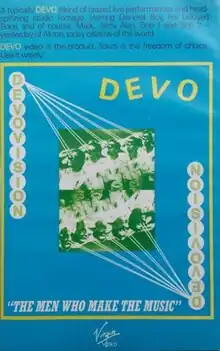 The Men Who Make the Music was the first home video released by the American new wave band Devo. Finished in 1979, the film was set to be the first Video LP under the title "DevoVision" (advertised in the inner sleeve of the "Duty Now for the Future" LP), but was shelved by Time Life due to concerns about its anti-music industry content. It was released in 1981. A DVD of this film was announced in 2000, due to be released by Rhino Records, but this never came to pass. In January 2014, Michael Pilmer, webmaster of the official Devo website, indicated a DVD release by MVD later in the year.[1] The DVD was released the following August, including a bonus feature of Devo's 1996 reunion show at the Sundance Film Festival.