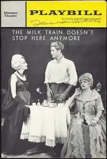 The Milk Train Doesn't Stop Here Anymore (1963) is a play in a prologue and six scenes, written by Tennessee Williams. He told John Gruen in 1965 that it was "the play that I worked on longest," and he premiered a version of it at the Festival dei Due Mondi in Spoleto, Italy, in July 1962.[1] Its first American production was in January 1963 on Broadway at the Morosco Theatre, starring Hermione Baddeley.[2][3] Reviews of the play were poor, although a newspaper strike prevented them from reaching audiences; the play ran for only 69 performances.