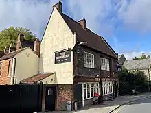 The Mischief occupies the remaining parts of a sixteenth-century courtyard house, with the east end (which faces the road) being rebuilt in the nineteenth century when the road was widened to accommodate trams.[1] It is situated on Fye Bridge Street, to the south of St Clement's Church. The house belonged to grocer and mercer Alexander Thurston who became mayor in 1600. In 1599, he incorporated stone fireplaces with his merchant's mark in the left-hand spandrel and the arms of his wife's family, the Aldrich family, in the right-hand spandrel. One of the fireplaces still exists and is behind the bar.[2] The north range is constructed of flint on a limestone pedestal.[2] On the north wall of this range are two six-light and one seven-light mullion windows on the first floor and three gable dormers.[1] Inside, the original floor and ceiling joists are later replacements. On the south wall of the north range, which overlooks a central courtyard, is an eight-light mullion window with arched transom. The wall also shows the spandrel of a wide arch which would have been situated above a large bay window, suggesting that the north range was once a hall. The rebuilt east range holds the parlour and an eight-light mullion window overlooking the courtyard.[2] The first floor contains two windows, with one a in a recessed canted bay.[3]