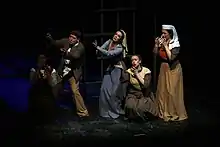 Defined as a "socialist critique of capitalist life", The Threepenny Opera was another musical drama Brecht did in collaboration with Kurt Weill that focused on the repercussions of living in a capitalist utopia "driving people to do anything to make money".[33] Through an informative yet confronting lens, this production demonstrated the lengths the masses would go to in order to achieve a fruitful living amidst a society that rewards ruthless and competitive behaviour.[33] Created as a reaction towards communism and in favour of the rising proletariat, Brecht and Weill sought to empower the working class, hoping that they would obtain power and reform the corrupt political agenda enforced by the ruling class.[4] Incorporating the conventions of epic theatre, utilising signs, narrative, v-effect and montage, The Three Penny Opera created a setting that shocked the everyday spectator, providing a more rational and authentic perspective on the action.[22]