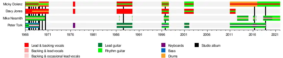 ![]() The Monkees in 1966. Clockwise from top left: Peter Tork, Micky Dolenz, Michael Nesmith, Davy Jones. | |
