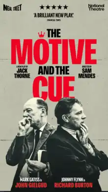The Motive and the Cue is a play written by Jack Thorne. The production opened, directed by Sam Mendes premiered on 21 April 2023 at the National Theatre in London. The play revolves around the history behind the 1964 Broadway modern-dress production of William Shakespeare's Hamlet starring Richard Burton in a production directed by Sir John Gielgud. As rehearsals progress, two ages of theatre collide and the collaboration between actor and director soon threatens to unravel.[1][2] The original cast includes Johnny Flynn as Burton, Mark Gatiss as Gielgud, and Tuppence Middleton as Elizabeth Taylor.[3]