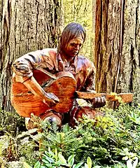 A wooden sculpture of Neil Young is situated right outside the entrance of the restaurant. It is sitting amongst tall redwood trees.