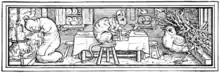 The Mouse, the Bird, and the Sausage live happily together. The Bird brings home wood from the forest; the Mouse delivers water, makes the cooking fire, lays the table; and the Sausage cooks.