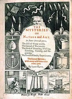 The Mysteries of Nature and Art is a book by John Bate written in 1634. The book acts as a practical guide for amateur scientific experiments, and is divided into four sections: Water Workes, Fyer Workes, Drawing, Colouring, Painting and Engraving, and Divers Experiments.[1] It inspired Isaac Newton during his younger years, in particular the section on fire Drakes, kites with firecrackers tied to their tails.[1] It contains one of the earliest depictions of fireworks and their preparation to be detailed in the English language, in a similar manner to the preceding De la pirotechnia.
