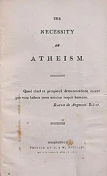 "The Necessity of Atheism" is an essay on atheism by the English poet Percy Bysshe Shelley, printed in 1811 by Charles and William Phillips in Worthing while Shelley was a student at University College, Oxford.