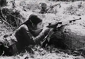 People's War was Newsreel’s 43rd film and, at 40 minutes, one of their longer early films. It was released in late 1969, but only after a court battle with the U.S. Government. The film's original footage was seized by US Customs agents when the filmmakers, Fruchter, Kramer and Douglas, arrived at Kennedy International Airport on August 7, 1969. While the film was being examined by Army intelligence agents, the filmmakers sued in the U.S. District court accusing the Government of trying to "harass and intimidate" them for exercising their First Amendment right of free speech. Within three days the Government had backed down and returned the 12,000 feet of film. The film itself recorded the Vietnamese people as they waged their country's fight against the U.S. military invasion. It is one of the few American made films to look at the war from the perspective of the Vietnamese. IMDb calls it "a vivid portrait of the countryside and ways of life during the war.".[26][27][28][29]