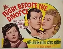 The Night Before the Divorce is a 1942 American comedy film directed by Robert Siodmak and starring Lynn Bari, Mary Beth Hughes and Joseph Allen, adapted from the 1937 play of the same name by Gina Kaus and Ladislas Fodor.[1]