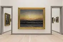 The North Sea in a Storm is a painting of the sea at Højen on the west coast of Skagen Odde. Measuring 176 by 234 centimetres (69 in × 92 in) it is one of Tuxen's largest works. As a result of its monumental size, it gives the observer the impression he is standing beside the turbulent sea, especially as the waves reach right to the bottom of the frame. The blues and greens of the sea contrast with the warm orange and yellow shades of the sky. The sun has just set, its last rays reflected in the lower waves. While many of the works of the Skagen Painters depict the beaches, Tuxen's painting is restricted to the sea itself.[1]