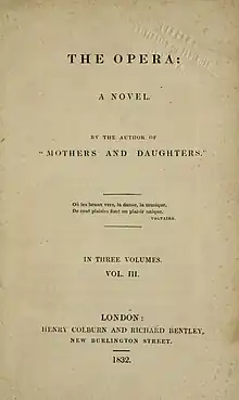 The Opera is an 1832 novel by the British writer Catherine Gore, originally published in three volumes.[1] It is part of the tradition of silver fork novels focusing on British high society of the later Regency era.[2] [3] One contemporary reviewer launched a critical attack on its elitism, and lack of realism about everyday lives.[4] The novel makes many references to the ongoing debate about the Reform Bill.[5]