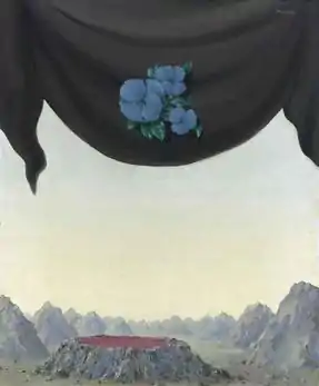 In those pictures, Magritte reintroduced the theme of the nude which he had explored in his earlier painting, Black Magic, but added this curtain element, playing with the various implied textures of the elements depicted. Magritte appears to have used the curtain device again and again after introducing it in The Palace of Memories. In it, he had found a means of adding a level of dialogue concerning the entire nature of art, of representation and of painting. By creating a perspectival landscape of seemingly colossal proportions in the background, with the curtain in the foreground, Magritte is deliberately bringing our attention to the entire process of imitation that underpins the act of painting itself. He is pointing to the artifice of his own profession, celebrating it. And the flowers floating in the foreground add a garnish, a flash of flair, that both emphasises and finalises this process of revelation.[4]