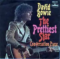 After its recording, Bowie premiered "The Prettiest Star" live at a BBC radio session on 5 February 1970.[1] To the displeasure of his manager Kenneth Pitt, Bowie chose the song as his next single, Pitt favouring "London Bye Ta-Ta";[lower-alpha 1][7][9] it ultimately marked the end of Pitt's influence on the artist.[4] Bowie's label, Mercury Records, hoped the song would demonstrate Bowie's range as a songwriter.[3][6] Issued as the follow-up single to "Space Oddity" in the United Kingdom only on 6 March 1970,[1][6] with "Conversation Piece" as the B-side,[10] its release coincided with The World of David Bowie compilation, which collected several songs and unreleased material from Bowie's time with Deram.[5][10] The single received praise from music journalists.[1] The NME hailed it as "a thoroughly charming and wholly fascinating little song ... the self-penned lyric is enchanting, if somewhat enigmatic – and the melody is haunting and hummable ... I like it immensely".[1] Music Business Weekly described it as "an immediately infectious number and a very strong follow-up", Record Mirror commended "a melodic and interesting production", and Disc & Music Echo found it "a lovely, gentle, gossamer piece ... the most compact, catchy melody I've ever heard. A hit indeed."[1]