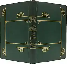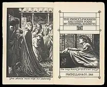 The Prince's Progress and Other Poems is Christina Rossetti's second volume of poetry, published by Macmillan in 1866. Christina's brother Dante Gabriel Rossetti designed the illustrations and bindings for the publication, just as he had for her first volume, Goblin Market and Other Poems. The Prince's Progress tells the story of a princess awaiting the return of her prince. After tarrying due to a series of temptations and self-indulgences, the prince returns only to find that the princess has died.[1] Dante Gabriel Rossetti's frontispiece illustration depicts the grief-stricken prince upon hearing the news of his princess's death; the title illustration depicts the princess staring longingly out the window as she waits for her prince to return. The 1866 edition contains 46 poems in addition to "The Prince's Progress."