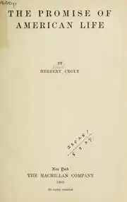 The Promise of American Life is a book published by Herbert Croly, founder of The New Republic, in 1909. This book opposed aggressive unionization and supported economic planning to raise general quality of life. By Croly's death in 1930, only 7,500 copies of The Promise of American Life had been sold. Despite this, the book was immensely influential,[1][2][3][4] influencing Theodore Roosevelt to adopt the platform of the New Nationalism after reading it, and being popular with intellectuals and political leaders of the later New Deal.[5]