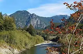 The history of the formation of the Cascade Mountains dates back millions of years ago to the late Eocene Epoch.[5] During the Pleistocene period dating back over two million years ago, glaciation advancing and retreating repeatedly scoured the landscape leaving deposits of rock debris.[5] The last glacial retreat in the area began about 14,000 years ago and was north of the Canada–US border by 10,000 years ago.[5] The U-shaped cross section of the river valleys is a result of that recent glaciation. Uplift and faulting in combination with glaciation have been the dominant processes which have created the tall peaks and deep valleys of the Cascade Range.