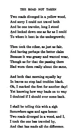 "The Road Not Taken" is one of Frost's most popular works. Yet, it is a frequently misunderstood poem,[7] often read simply as a poem that champions the idea of "following your own path". Actually, it expresses some irony regarding such an idea.[8][9] A 2015 critique in the Paris Review by David Orr described the misunderstanding this way:[7]