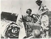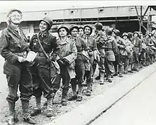 The Second Armored Division, including its ambulance drivers, crossed the Channel on August 1, 1944, joining General George S. Patton’s Third Army for the ongoing Battle of Normandy. While not combatants, Rochambelles were bombed, shot at, taken prisoner, and one disappeared forever.[4] They learned to overcome their fear, and their performance was such that by the time they got to Paris, where General Leclerc had expected to recruit male drivers, he called them to assemble and announced they had earned their place in the division. "You have carried out [your mission] with such brio and devotion, winning the admiration of your commanders and all in your unit, that I will keep you," he said.[5]
