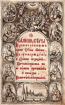 The Rock of Faith, a.k.a. The Stone of Faith (Russian: Камень веры) is a major anti-Protestant treatise written by archbishop Stefan Yavorsky in 1713–1715.[1] Its full title The Stone of faith: for the sons of the holy Orthodox Church — for affirmation and spiritual creation; for those who stumble over a block of stumbling and temptation — for getting up and correcting, Church Slavonic: Камєнь вѣры: православнымъ цєрквы святыѧ сыномъ на утвєрждєнїє и духовноє созиданїє. Прєтыкающымсѧ жє ω камєнь прєтыканїѧ и соблазна. На востанїє и исправленїє. Later it was also published under the title The Stone of Faith of the Orthodox Catholic Eastern Church, Russian: Камень веры православно-кафолическия восточныя Церкви...[1]