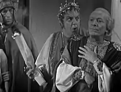 Nero (Derek Francis) reprimands the Doctor (William Hartnell) for setting fire to his plans. The performances of Francis and Hartnell in the serial received praise.[1][2][3]