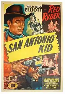 The San Antonio Kid is a 1944 American Western film directed by Howard Bretherton starring Wild Bill Elliott in the role of Red Ryder.[1] It was the fourth of twenty-three Red Ryder feature films that would be produced by Republic Pictures and the first shot without George "Gabby" Hayes who had starred with Elliott since he relocated to Republic Pictures.[2] The picture was shot on the studio's back lot along with outdoor locations at Iverson Ranch, 1 Iverson Lane, Chatsworth, Los Angeles, CA, USA.[3]
