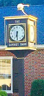 A Savings Bank branch in the Greenwood district of Wakefield, Massachusetts, in July 2021, showing the clock tower distinctive of Savings Bank branches.