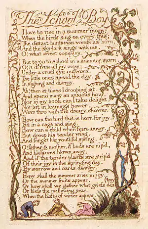 "The School Boy" is a 1789 poem by William Blake and published as a part of his poetry collection entitled Songs of Experience. These poems were later added with Blake's Songs of Innocence to create the entire collection entitled "Songs of Innocence and of Experience Shewing the Two Contrary States of the Human Soul". This collection included poems such as "The Tyger", "The Little Boy Lost", "Infant Joy" and "The Shepherd". These poems are illustrated with colorful artwork created by Blake first in 1789.[2] The first printing in 1789 consisted of sixteen copies.[2] None of the copies of Songs of Innocence are exactly alike as some of them are incomplete or were colored in posthumously "in imitation of" other copies.[2]