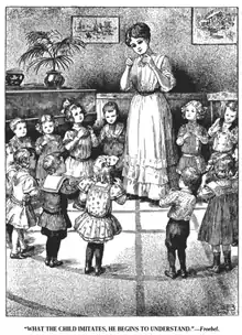 Drawing of Teacher Leading Children in "Finger Plays", one of the methods of imitation and abstraction preferred by Froebel.