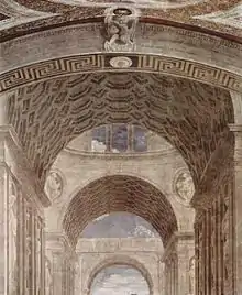 However, to Heinrich Wölfflin, "it is quite wrong to attempt interpretations of the School of Athens as an esoteric treatise ... The all-important thing was the artistic motive which expressed a physical or spiritual state, and the name of the person was a matter of indifference" in Raphael's time.[8] Raphael's artistry then orchestrates a beautiful space, continuous with that of viewers in the Stanza, in which a great variety of human figures, each one expressing "mental states by physical actions", interact, in a "polyphony" unlike anything in earlier art, in the ongoing dialogue of Philosophy.[9]