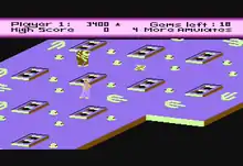 Points are awarded for collecting gems, a spell, or a piece of "amulate," and extra lives are awarded every 20 000 points.