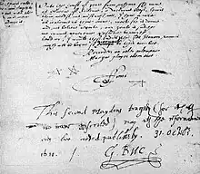 The play's original title is unknown. The manuscript bears no title, and the censor, George Buc, added a note beginning "This second Maiden's Tragedy (for it hath no name inscribed)...". Buc was possibly comparing the play to Beaumont and Fletcher's The Maid's Tragedy. Buc's comment confused a seventeenth-century owner of the manuscript, Humphrey Moseley, who listed the play in the Stationers' Register as The Maid's Tragedy, 2nd Part.[3] Buc's title has stuck and the play is usually referred to as The Second Maiden's Tragedy.