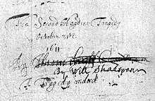 Although The Second Maiden’s Tragedy has been generally credited to Middleton, there is evidence that Shakespeare could have contributed to the play. When examining the manuscript, there are slips of paper that were added to the prompt book, which shows revisions or notes. These slips of paper have been examined and it is quite certain that Middleton did not write these revisions, as they do not resemble his handwriting. However, the notes resemble the handwriting assumed to be Shakespeare's. It is also possible that Shakespeare could have written these notes because at the time the play was to be produced, Shakespeare was still in the King's Court, and could have been working on the play and had influence. Therefore, despite the consensus that Shakespeare is not responsible for the writing of The Second Maiden’s Tragedy, it is quite possible that Shakespeare was involved in its production and revision.[13]