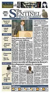 The first issue of The Sentinel was published on October 3, 1966, shortly after the charter quarter of Kennesaw State. Robert McDearmid served as the charter editor in chief.[2] The paper has printed continuously since its founding. It is published weekly during the school year, with limited issues during the summer semester. In 2005 it was one of 25 collegiate newspapers to receive the Pacemaker award from the Associated Collegiate Press for the print edition,[3] and was a finalist for its online edition.[4]