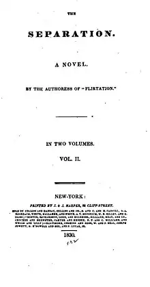 The Separation is an 1830 novel by the British writer Lady Charlotte Bury, published in three volumes.[1] It falls into the tradition of silver fork novels, popular at the time.[2] It was published in New York by Harper the same year in two rather than three volumes. It was published anonymously, although Bury's authorship was widely known. A reviewer attacked it for recycling the plot entirely from Bury's 1812 novel Self-indulgence, although the resulting publicity seemed to help the novel's sales.[3]