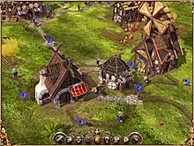Whether playing in single-player or multiplayer mode, each game begins the same way; the player has one building, a warehouse/headquarters, in which are a set amount of raw materials and tools.[16][17] The basic gameplay revolves around serfs (the titular "settlers") who transport materials, tools and produce, and who populate and perform the requisite task of each building. As the player constructs buildings and thus requires settlers to occupy them, the settlers automatically emerge from the warehouse as needed.[18] As the settlement continues to grow in size, the warehouse's quota of settlers will eventually be reached, and the player will need to build an additional warehouse to generate more settlers. At no point does the player directly control any individual settler - instead, general orders are issued (such as ordering the construction of a building), with the AI handling the delegation of orders to specific settlers.
