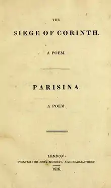The Siege of Corinth is a rhymed, tragic narrative poem by Lord Byron. Published in 1816 by John Murray in London with the poem Parisina, it was inspired by the Ottoman massacre of the Venetian garrison holding the Acrocorinth in 1715 – an incident in the Ottoman reconquest of the Morea during the Ottoman-Venetian Wars.