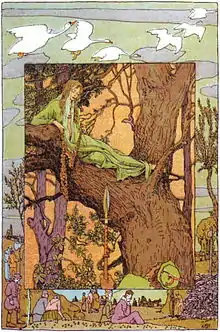 - Irish novelist Padraic Colum used a similar tale in his novel The King of Ireland's Son, in the chapter The Unique Tale: the queen wishes for a blue-eyed, blonde-haired daughter, and carelessly wishes her sons to "go with the wild geese". As soon as the daughter is born, the princes change into gray wild geese and fly away from the castle.[55]