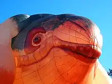 Much of the public criticism has been focused on the five breasts which hang from each side of the balloon, with a Twitter user calling it "terrifyingly nipply".[16][17][18] The director of the Canberra Museum and Gallery wrote an opinion article praising The Skywhale, arguing that the strength of the design "arises from how it concentrates the wonder, awe and mystery we experience in nature, with an urgent insistence on social engagement".[19] The Canberra Times' art critic Kerry-Anne Cousins complimented the boldness of the design, and stated that "I think it's a mark of the sophistication of Canberra that we can have this kind of debate".[15] In response to the criticism of the balloon's design, Piccinini stated that it wasn't intended to be sexual and the breasts represent how female whales feed their calves. She also believed that The Skywhale is likely to win greater support once Canberrans see it in person.[2][14] Piccinini was hurt by the criticism of the artwork in Australia, and in 2017 believed that it would be "almost impossible" to attract funding to fly it in the country again.[20] In 2019 The Canberra Times reported that The Skywhale had attracted more publicity than any other element of Canberra's centenary celebrations.[21]