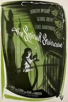 The Spiral Staircase is a 1946 American psychological horror film[5] directed by Robert Siodmak and starring Dorothy McGuire, George Brent, and Ethel Barrymore. Set over the course of one evening, the film follows a mute young woman in an early-20th century Vermont town who is stalked and terrorized in a rural mansion by a serial killer targeting women with disabilities. Gordon Oliver, Rhonda Fleming, and Elsa Lanchester appear in supporting roles. It was adapted for the screen by Mel Dinelli from the novel Some Must Watch (1933) by Ethel Lina White.