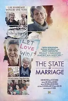 The State of Marriage is a 2015 documentary film about the origins of the marriage equality movement, focusing on the decades of grassroots advocacy by lawyers Mary Bonauto, Susan Murray, and Beth Robinson and the 1999 Vermont Supreme Court case Baker v. Vermont.[1][2] The film had its world premiere at the 2015 Provincetown International Film Festival on 18 June 2015.[3] It is written and directed by Jeff Kaufman, and produced by Kaufman and Marcia Ross.[4] Funding for the film's post-production and editing work was partially raised through a successful Indiegogo crowdfunding campaign.[5]