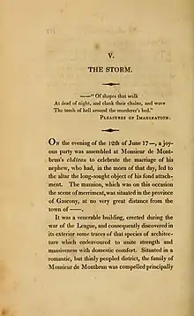 "The Storm" was reprinted a number of times, including in Horace Welby's Signs before Death, and Authenticated Apparitions (1825) as "The Midnight Storm (From the French)", William Charlton Wright's The Astrologer of the Nineteenth Century (1825) as "The Midnight Storm (A True Relation, from the French)", Ambrose Marten's The Stanley Tales, Original and Select (1827), The Annual Pearl: Or, Gift of Friendship (1840s), and L. W. de Laurence's The Old Book of Magic (1918) as "The Midnight Storm".[12][13][14][15][16] The "Midnight Storm" reprints are slightly modified from the original text, with the date mentioned at the start of the story changed from "12th of June 17—" to "12th of June, ——", and de Laurence's version editing the first line of the epigraph to read "Of Evil Spirits that walk".[12][13][16]