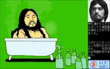 A caricature of Shoko Asahara depicting him bottling his bathwater; the water is sold to Aum Shinrikyo members, and other imagery in the game shows people injecting it into their bodies using an IV drip or with syringes.[3]