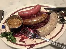 A wurstplatte from The Student Prince, with knackwurst, boar and cranberry, and bratwurst (top to bottom)