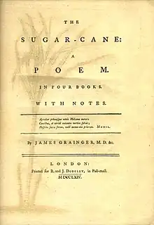 Although Grainger's The Sugar Cane remains the best known 18th century poem on a West Indian subject, others were written both before and after it. Nathaniel Weekes’ Barbados, a poem (1754) was a forerunner that also included a consideration of sugar cane.[2] Not long after the appearance of Grainger's work, John Singleton published A general description of the West Indian islands (1767) in which he paid tribute to the poem as a successful model.[3] Later there was also a sideways allusion to Grainger in the anonymous Jamaica, a poem in three parts (1777), where the “Argument” to part one declares that “The Muse thinks it disgraceful in a Briton to sing of the Sugar-cane, since it is owing the Slavery of the Negroes”.[4]