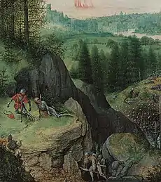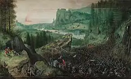 As with most of his subjects taken from the Bible, Bruegel treats Saul's suicide as a contemporary event, showing the armies in 16th century armour. In 1529, the German painter Albrecht Altdorfer had shown the clash of the forces of Alexander the Great and Darius at the Battle of the Issus in this way, and in many other respects, too, Bruegel is in Altdorfer's debt, particularly in the representation of the tiny, massed figures of the soldiers and their forests of lances.[4] Bruegel may also have looked at the battle-scenes of another German painter, Jörg Breu the Younger, and at a now lost battle-scene by the Antwerp landscape painter Joachim Patinir which is mentioned by biographer Karel van Mander.[5]