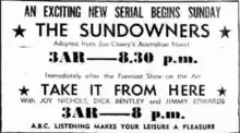 The Sundowners is a 1953 Australian radio serial based on the novel of the same name by Jon Cleary.[2] It was a 15-minute morning serial for the ABC starting in April 1953[3] and played as a night-time serial in November of that year (where episodes ran for 30 minutes).[4][5]