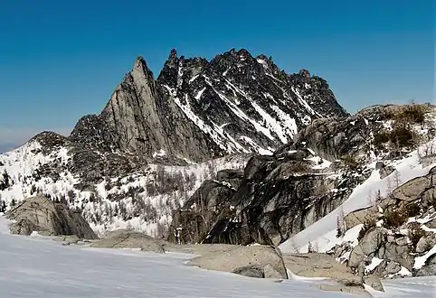 The Temple[3] is an 8,292-foot (2,527-metre) granite mountain summit located in Chelan County of Washington state. The Temple is part of The Enchantments, set within the Alpine Lakes Wilderness. The Temple belongs to the Stuart Range which is a subset of the Cascade Range. The nearest higher peak is Enchantment Peak, 1.55 miles (2.49 km) to the west, and the nearest town is Leavenworth, 8 miles (13 km) to the northeast. The mountain hosts many granite spires with names like The High Priest, The Boxtop, Flake Tower, Comet Spire, Razorback Spire, The Meteor, The Professor, Lighthouse Tower, Black Pyramid, and the most recognizable Prusik Peak. The highest point of the mountain is called Mt. Temple.[4] Precipitation runoff from the mountain drains into Snow Creek which is a tributary of Icicle Creek.