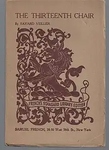 The Thirteenth Chair is play by the American writer Bayard Veiller which premiered in 1916.[1] It enjoyed a lengthy run on Broadway initially at the 48th Street Theatre before later transferring to the Fulton Theatre. A mystery the action takes place entirely in the drawing room of a large, wealthy house in New York City. The author's English wife Margaret Wycherly played a prominent role in the original production which ran for 328 performances. Mrs Patrick Campbell took over the role when it debuted in London's West End the following year.[2]
