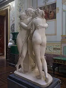 Antonio Canova's statue The Three Graces is a Neoclassical sculpture, in marble, of the mythological three Charites, daughters of Zeus – identified on some engravings of the statue as, from left to right, Euphrosyne, Aglaea and Thalia – who were said to represent youth/beauty (Thalia), mirth (Euphrosyne), and elegance (Aglaea). The Graces presided over banquets and gatherings, to delight the guests of the gods. As such they have served as subjects for historical artists including Sandro Botticelli and Bertel Thorvaldsen. A version of the sculpture is in the Hermitage Museum, and another is owned jointly and exhibited in turn by the Victoria and Albert Museum, Scottish National Gallery while another one is in Galerie Plastik in Hořice.